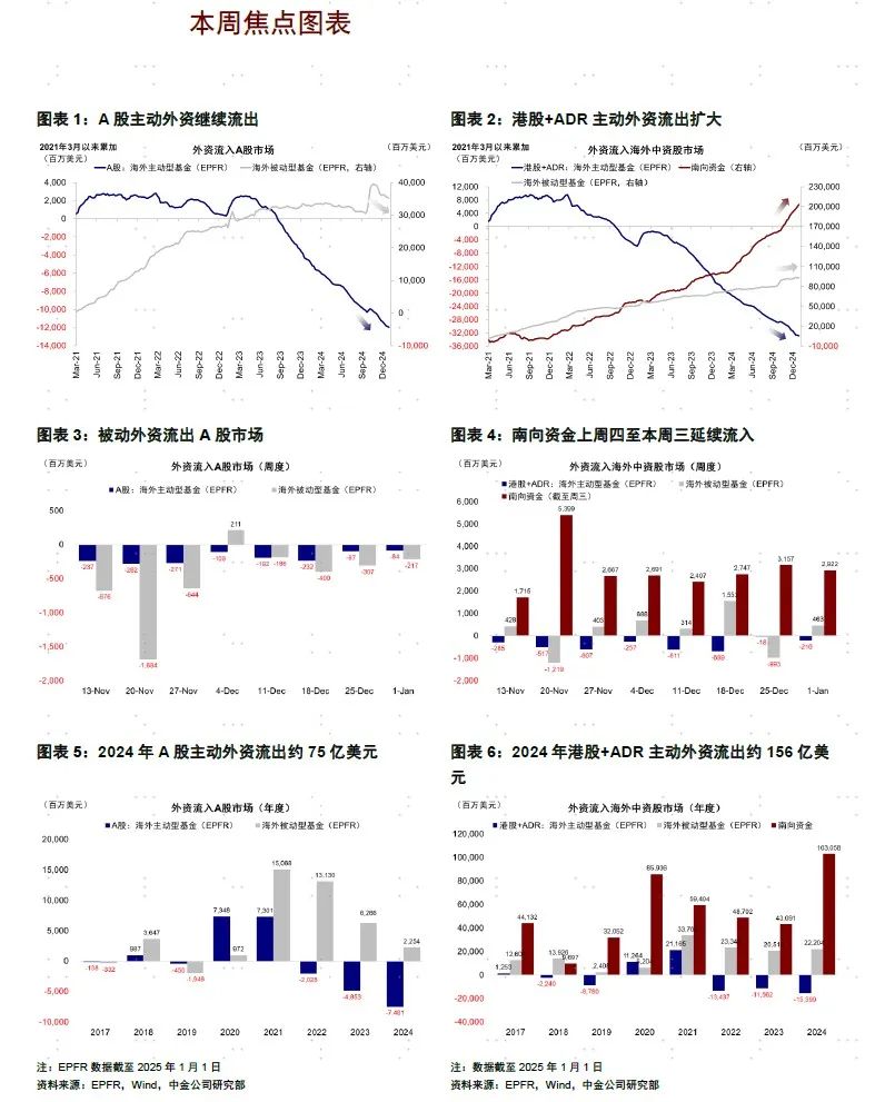 国外资金:EPFR走漏主动外资流出A股市集小幅放缓,加快流出港股和ADR市集。放抄本周三(12月26日-1月1日),A股主动外资流出0.8亿好意思元(vs. 上周流出1.0亿好意思元),被迫资金流出2.2亿好意思元(vs. 上周流出3.1亿好意思元);与此同期,港股和ADR国外资金合座流入2.5亿好意思元(vs. 上周流出10.1亿好意思元),其中主动资金流出2.2亿好意思元(vs. 上周流出0.2亿好意思元),被迫资金流入4.6亿好意思元(vs. 上周流出9.9亿好意思元)。