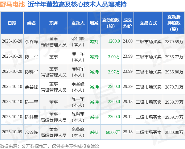 证券之星音书真钱老虎机娱乐网,证实10月21日市集公开信息、上市公司公告及来回所知道数据整理,野马电板(605378)最新董监高及联系东说念主员股份变动情况:2025年10月20日公司董事陈一军、董事,高等搞定东说念主员余谷峰、董事,高等搞定东说念主员陈科军共减合手公司股份6.09万股,占公司总股本为0.0234%。变动时间公司股价着落1.88%,10月20日当日收盘报23.49元。